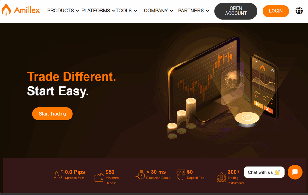 At first glance, Amillex.com presents an attractive package designed to catch a trader’s eye. Its key selling points are prominently displayed: