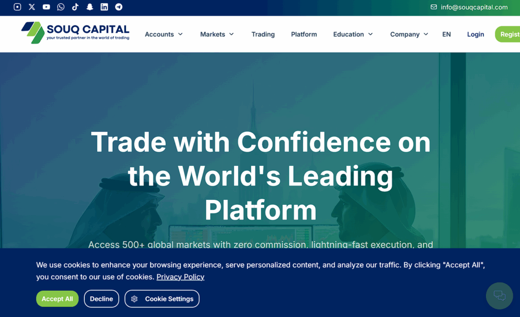 SouqCapital.com’s website makes a deliberate visual appeal. It incorporates design elements like Arabic calligraphy, geometric patterns, and a color scheme of deep blues and golds. The English-language section (/en) is professional, while subtle Arabic phrases enhance the feeling of regional authenticity. This aesthetic is a calculated trust-building exercise, aiming to resonate with investors who may perceive international brokers as distant or culturally incongruent.