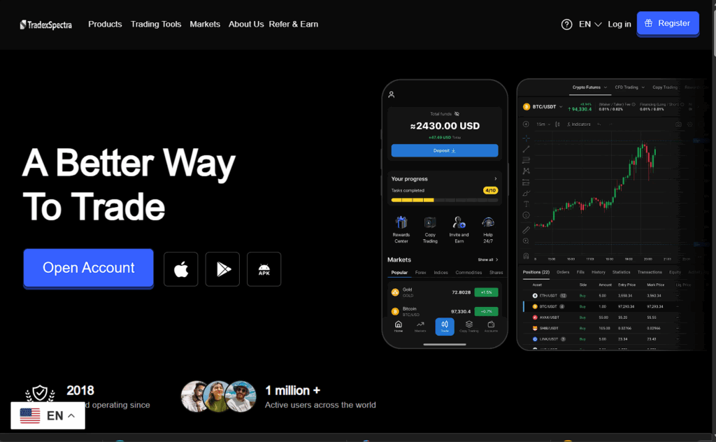 A visit to Tradexspectra.com presents a website that immediately projects scale and success. Key statistics are front and center: the brand claims to have been operating since 2018, boasts “1 million + active users,” and offers a “$20,000 Compensation Fund per user.” The platform lists an extensive suite of services: trading CFDs on forex, indices, and commodities; buying cryptocurrencies like Bitcoin outright; using proprietary WebTrader or MetaTrader 5; and participating in copy-trading.